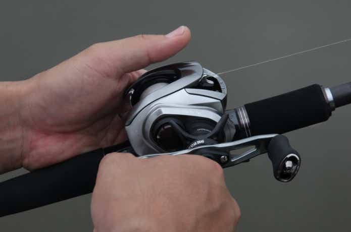 ベイトリールは、キャスト時に回転しているスプールに親指で触れて、ライン放出の調整(サミング)がしやすい構造をしています。