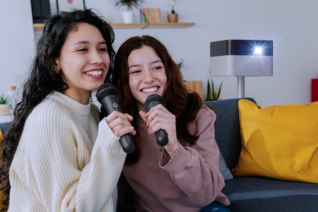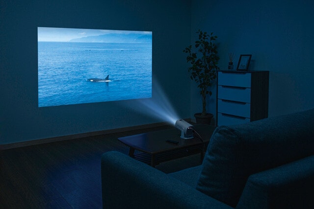 本体を設置するだけで上下左右の傾きを自動補正し、最大150インチでスクリーンに投写。「Google TV」を内蔵し動画サブスクに対応、スピーカーはSound by Boseテクノロジー搭載の高音質で再生。大画面でスマホ内の動画や画像を投写するのにも活用できますよ!