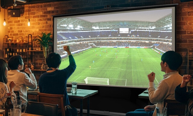 プロジェクターの映像は壁や天井に投写することができるが、映像クオリティ的には専用スクリーンでの視聴がベスト。本製品は4K対応の高精細スクリーンを採用し、動きが速くワイドな引き映像の多いスポーツ観戦にも最適!
