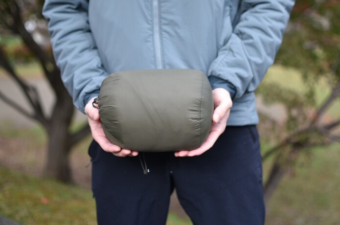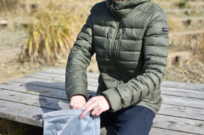 そして嬉しいのがこのコンパクトさ。付属の袋に収納すれば手に収まる程度のサイズまで小さくなってくれます。超絶コンパクト、とまではいきませんが、この暖かさを考えれば十分許容できるレベル。ザックに忍ばせられれば段違いの安心に繋がりそうです。