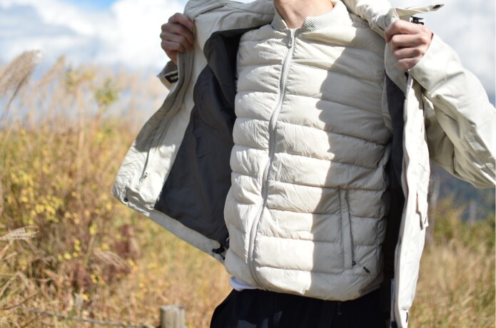 冷え込みを感じた際は、インナーダウンを着用。山域や季節によって着脱を使い分けることで、快適な衣服内温度をキープできるのは非常に魅力的だと感じました。