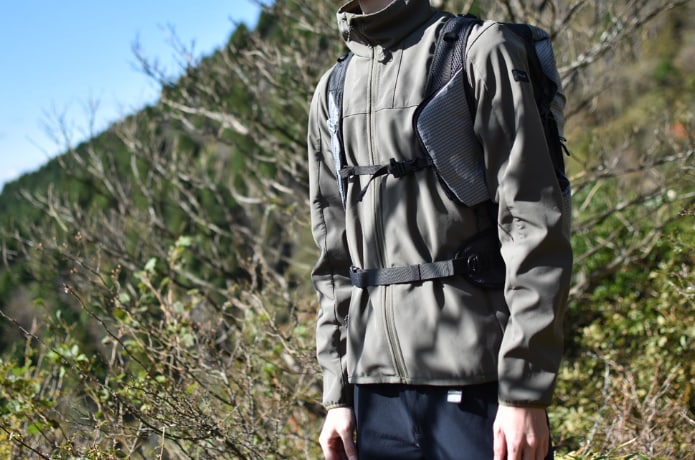 今回はまずインナーを外し、ウィンドシェルとして着用。しっかりとした生地感のため、スレなどにも不安なく使うことができました。