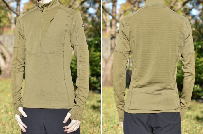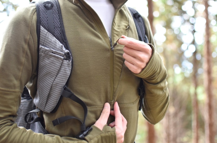 熱がこもった場合もハーフジップで調整可能。ジップが深めに設計されているため、大きく開けて一気に放熱、冷えてきたら少しずつジップを上げて保温、そんな切り替えがスムーズにできるのはありがたいポイントです。