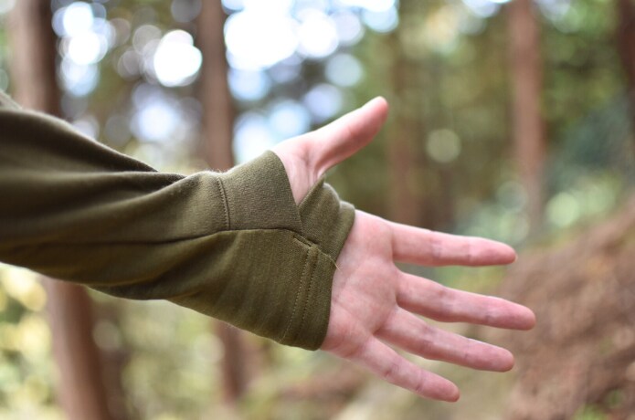 袖口にはサムホール(親指を通す穴)を搭載。手首をしっかり覆ってくれるため、冷え込み時にも手先の冷えを抑えられます。