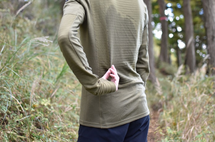 一方で通気性を高める工夫はあるものの、吸水性が高いというメリノウールの特性上、大量に汗をかいた場合は蒸発や乾燥が追いつかず、急登など高負荷のシーンでは背中の汗が気になるときも。