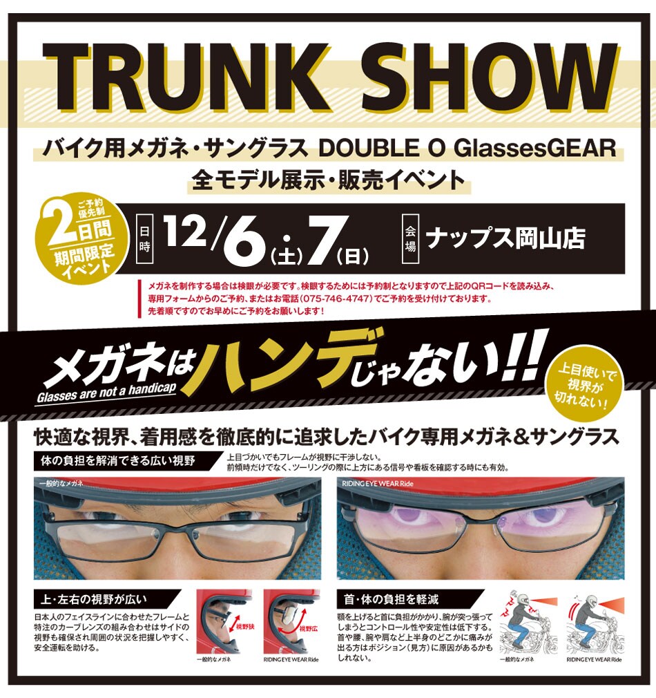 ダブルオーグラスギアは、バイク用メガネが体感できるイベント「TRUNK SHOW」を2025年12月6日(土)~7日(日)に、ナップス岡山店で開催すると発表した。