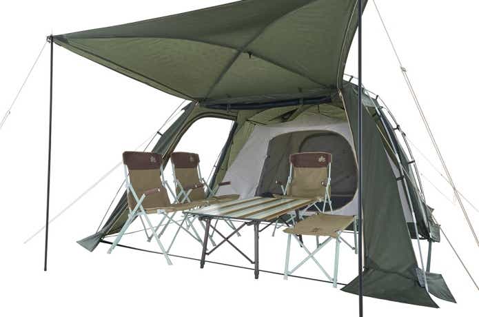 4人で眠れる寝室と広いリビングが1つになった、ロゴス の2ルームテント「neos PANEL スクリーンドゥーブル L-BD」。ロゴス独自の「パネルシステム」を採用した前室は、キャノピーポールで立ち上げれば広々としたリビングスペースに。