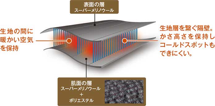 暖かさの秘密は、内部に“デッドエア(断熱となる空気の層)”をためこむボックス構造。空気は動かない状態でいると強力な断熱材となるため、この構造が持続的なぬくもりを実現します。