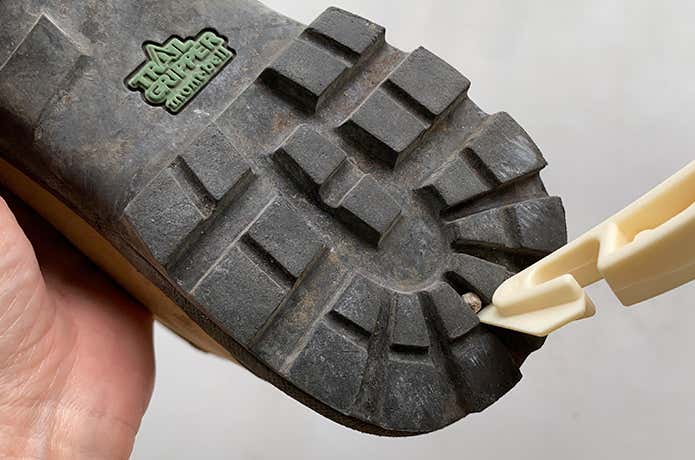 ソールの状態をチェック!小石などが挟まっている場合、ドライバーなどで取り除きます。また靴全体の状態もしっかり確認。