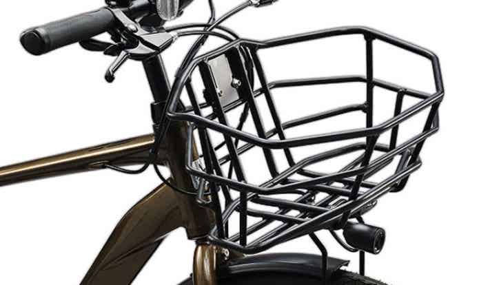 スタイリッシュな前かごは、通勤カバンにも対応する横長サイズ。荷物の落下を防ぐ工夫もされています。