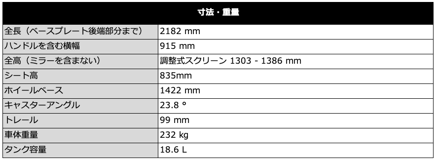 また、灯火類はオールLED、ターンバイターンナビゲーション機能付きのLCD+TFTコンビメーター、Bluetoothによるスマートフォン接続など、標準装備も充実しており、快適で安心できるライディングを提供します。