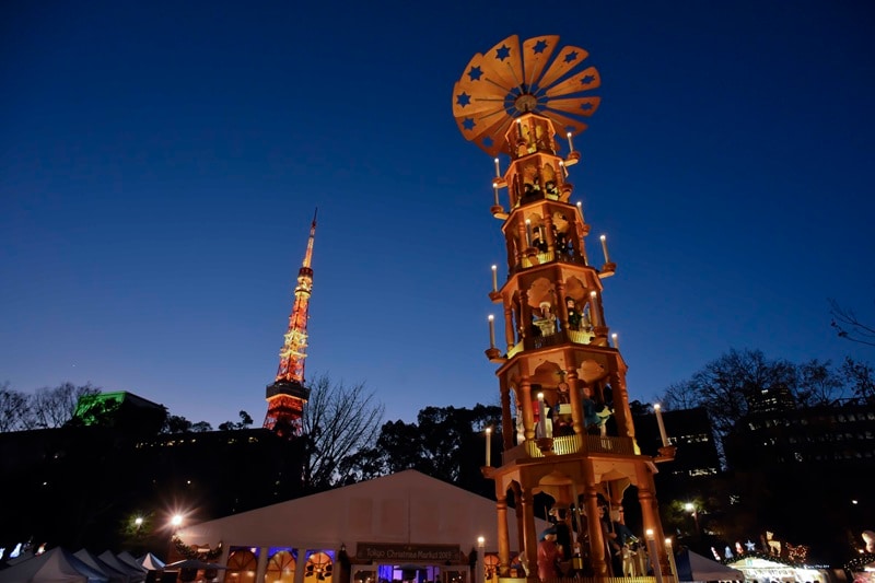御成門駅近くの芝公園会場では、ドイツの伝統的なクリスマスマーケットを開催。こちらにも世界最大級・高さ14メートルのクリスマスピラミッドが登場するほか、ドイツとチェコの国境付近にある「おもちゃの村」として知られる、ザイフェン村のくるみ割り人形のオブジェも必見です。東京タワーを望む絶好のロケーションに再現された、ヨーロッパの街並みを堪能しましょう。