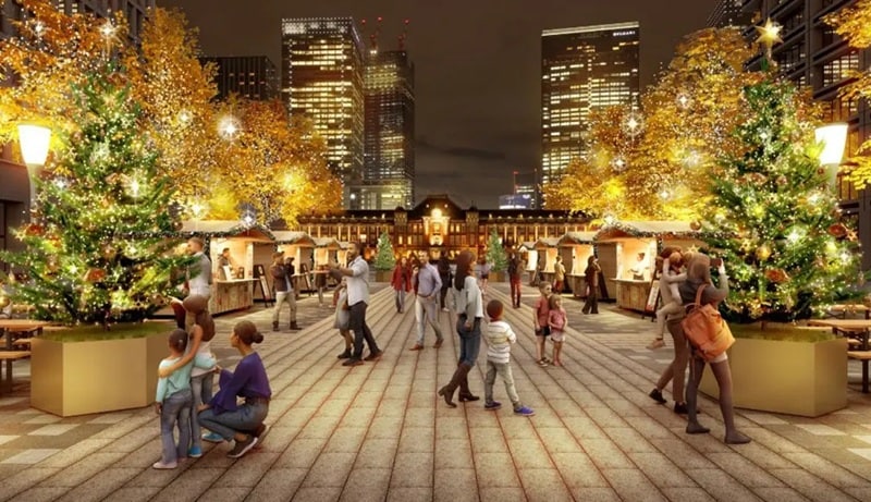 東京駅と皇居外苑を結ぶ行幸通りエリアでは、初めてクリスマスツリーを設置。ヒュッテ型の店でソーセージやローストチキン、ノンアルコールグリューワインなどドイツの定番メニューを楽しめます。