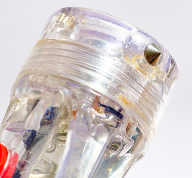 ほかにも、メジャーや電動ドライバーなどにも透明のものがありました。さらには透明の懐中電灯に車の窓を割るびょうが一体化したアイテムもありました。側面の基板上にLEDが並んでおり、その光を透過させるためという機能性重視でスケルトンのようです。