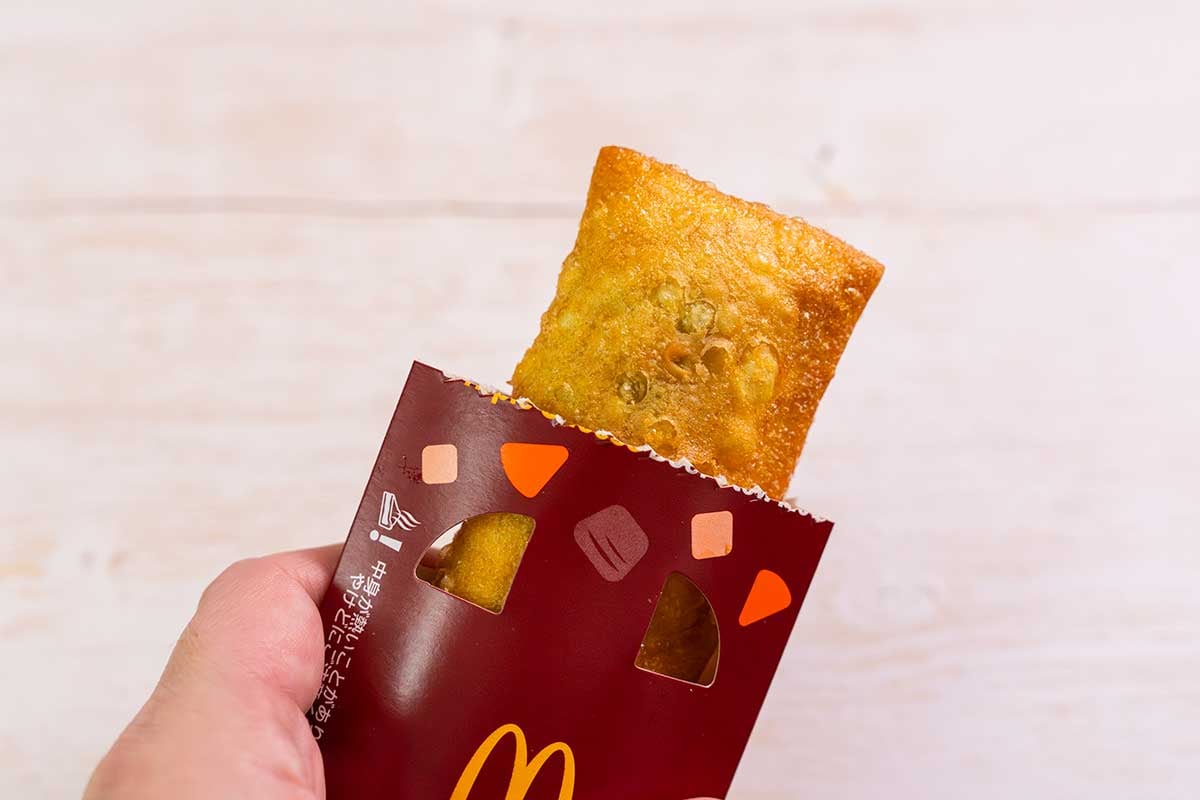マクドナルドのパイではおなじみのパッケージ形状なので、ワンハンドで手を汚さずに食べられます。