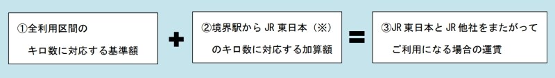JR東日本の路線からJR他社の路線へまたがって利用する場合の運賃計算方法も変更されます。改定後は、全利用区間の営業キロで算出した基準額に、JR東日本区間の営業キロに応じた加算額を加える「通算加算方式」が導入されます。