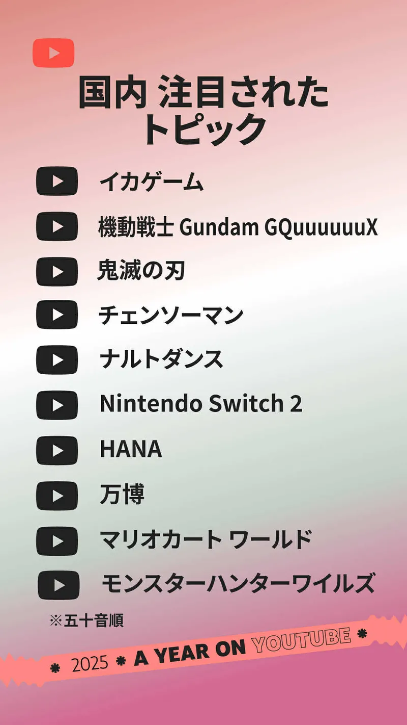 「国内 注目されたトピック」は、その年YouTube上で特に話題となったテーマを上位10件取り上げたものです。2025年は「機動戦士 Gundam GQuuuuuuX」「鬼滅の刃」「チェンソーマン」といったアニメ関連に加え、「モンスターハンターワイルズ」「Nintendo Switch 2」「マリオカート ワールド」などゲーム関連のトピックが並びました。また、2025年を象徴するイベントとして「万博」も選ばれており、エンタメと大型イベントの双方が注目を集めた1年だったことがうかがえます。