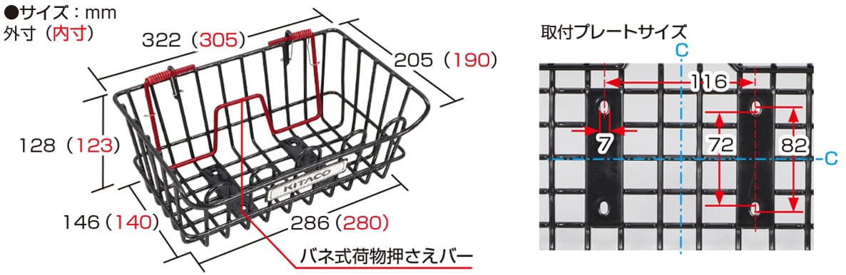 ●K·TOURブランド ●汎用 ●低背仕様 ●スチール製 ●樹脂コーティング ●バスケットサイズ 開口部:322mm×205mm 底部:286mm×146mm 深さ:128mm ●重量:約1.3kg(ステー類込み) ●バネ式荷物押さえバー装備 ●取付けボルト(長/短 各4本入り)、ナット、ワッシャ、ステー類付属