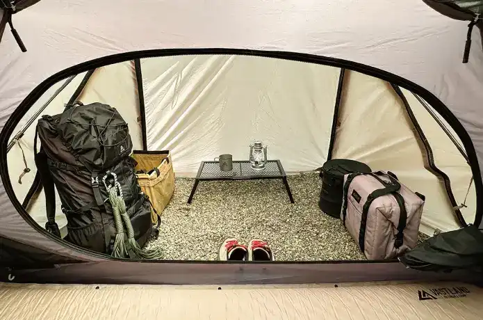 広い前室には、テント内に入れられない荷物を雨や泥から保護できるランディングゾーンが確保されている点も魅力。