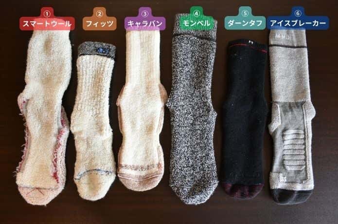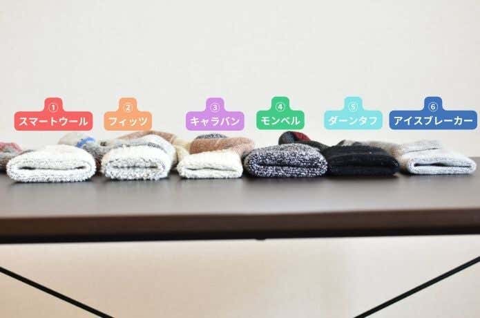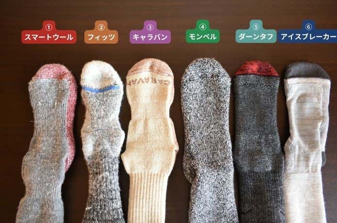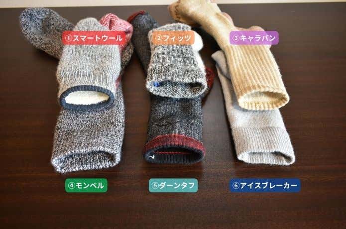 スマートウール=フィッツ=モンベル>キャラバン=ダーンタフ>アイスブレーカーで、3つのソックスがほぼ同じくらいの長さ。パイルの「密度」についてはモンベルが最も高くなっていました。