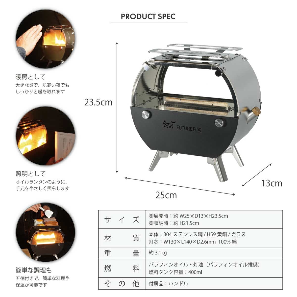 FUTURE FOX(フューチャーフォックス)から、卓上で“焚き火級の炎”を楽しめるオイルストーブ「灯火 ~Tomoshibi~」が登場。