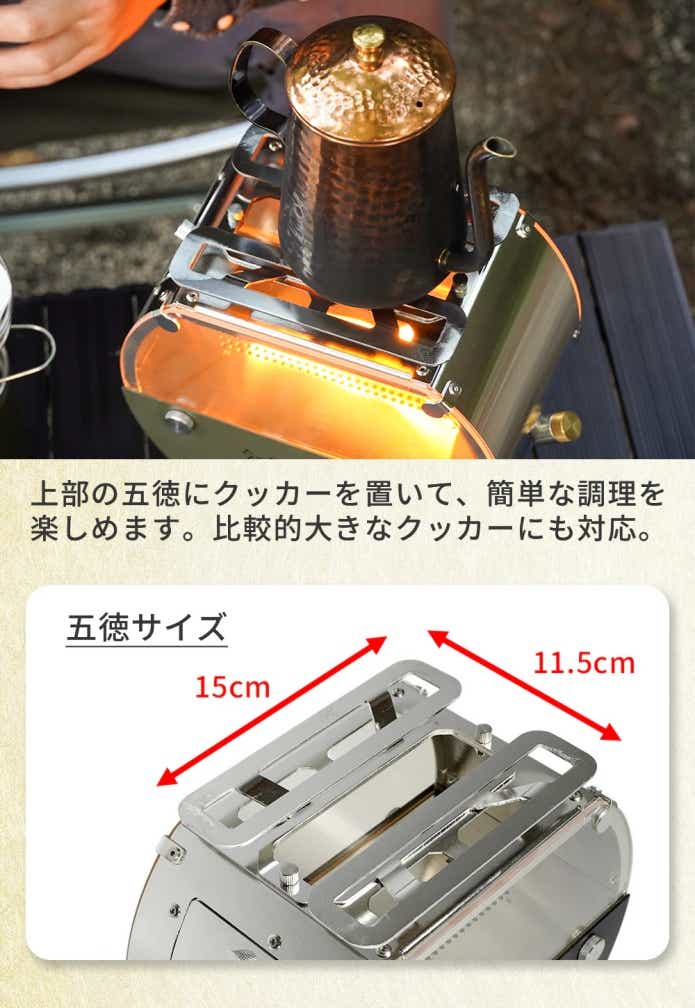 天面には五徳を備えており、湯沸かしや温めなどのちょい調理に対応。サイズは約15×11.5cmで安定感があり、ケトルや小鍋も安心して置けます。