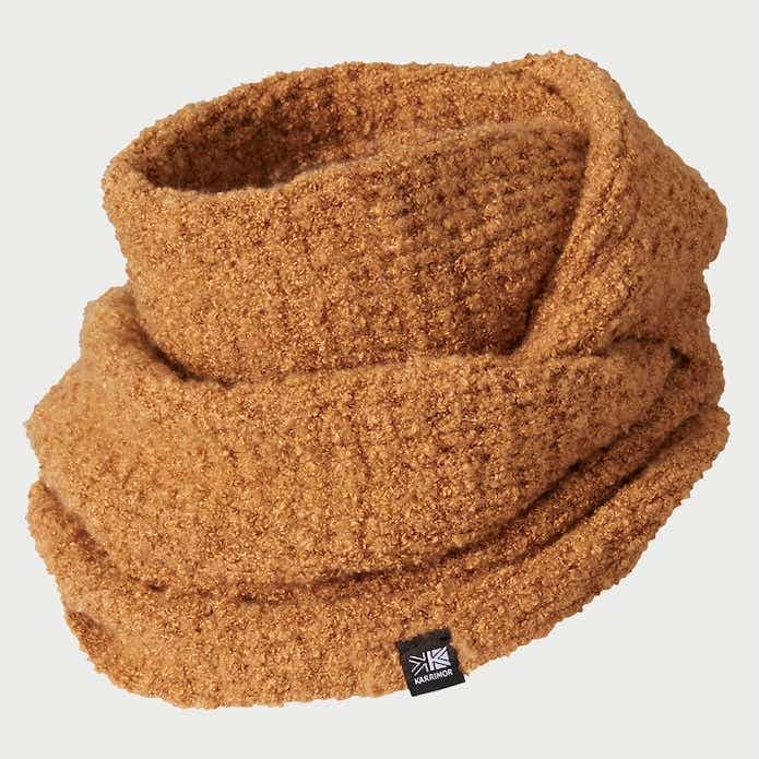 毛羽立たせたタム糸を使った、ソフトな肌触りのスヌード(かぶるタイプのネックウォーマー)。