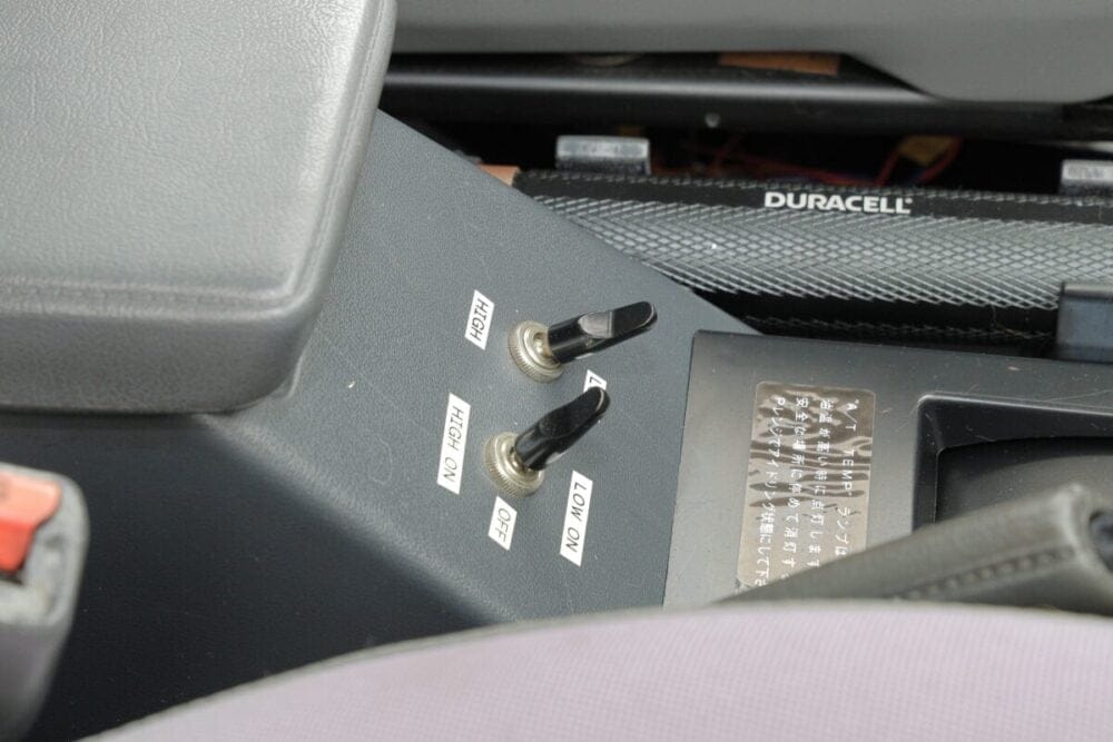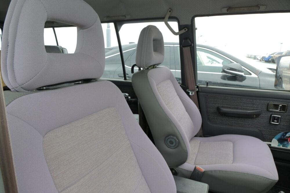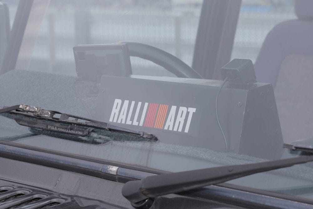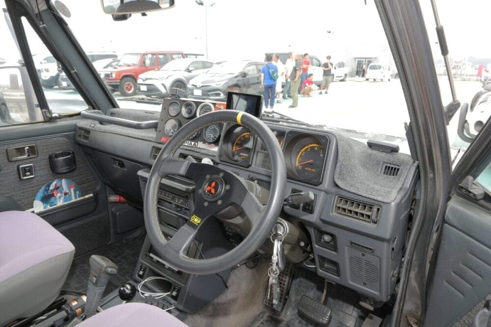 ハンドルはOMPを採用。ミツビシのエンブレムがポイントだ。ほかにシートヒーターを装備して、家族の快適性も確保している。