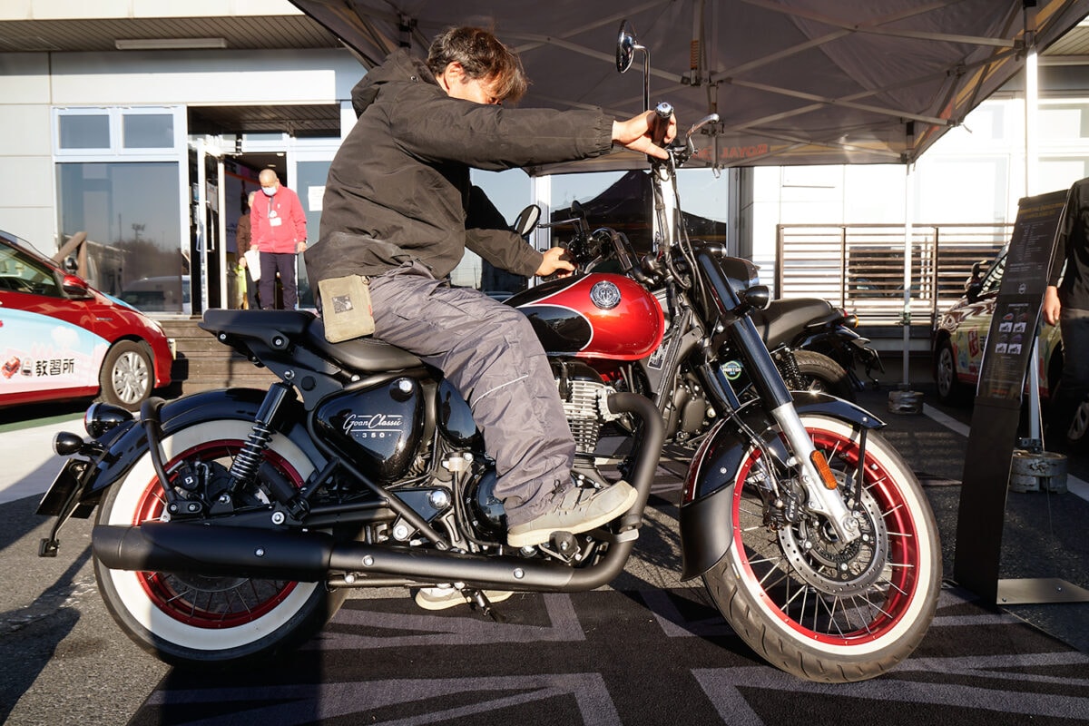 それでもデザインに目を引かれ、、「足着きはいいし、ハンドル位置もちょうどいい。停車時や取り回し時にバイクを足で支えるのも不安感はない」と跨り体験を楽しんでくれた。