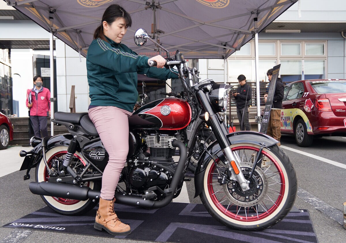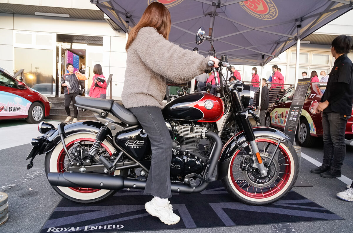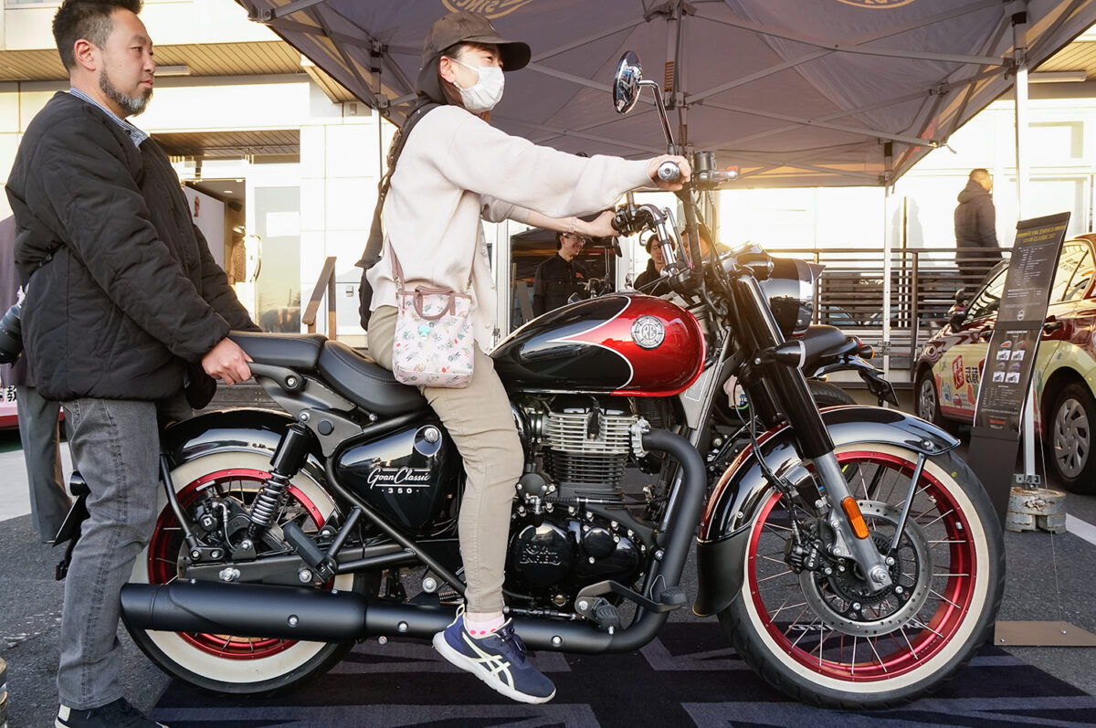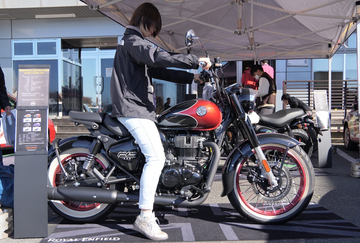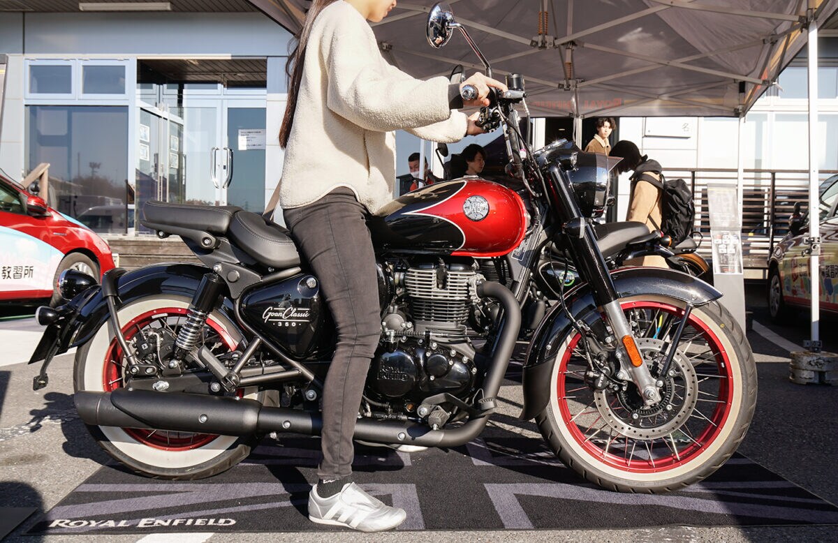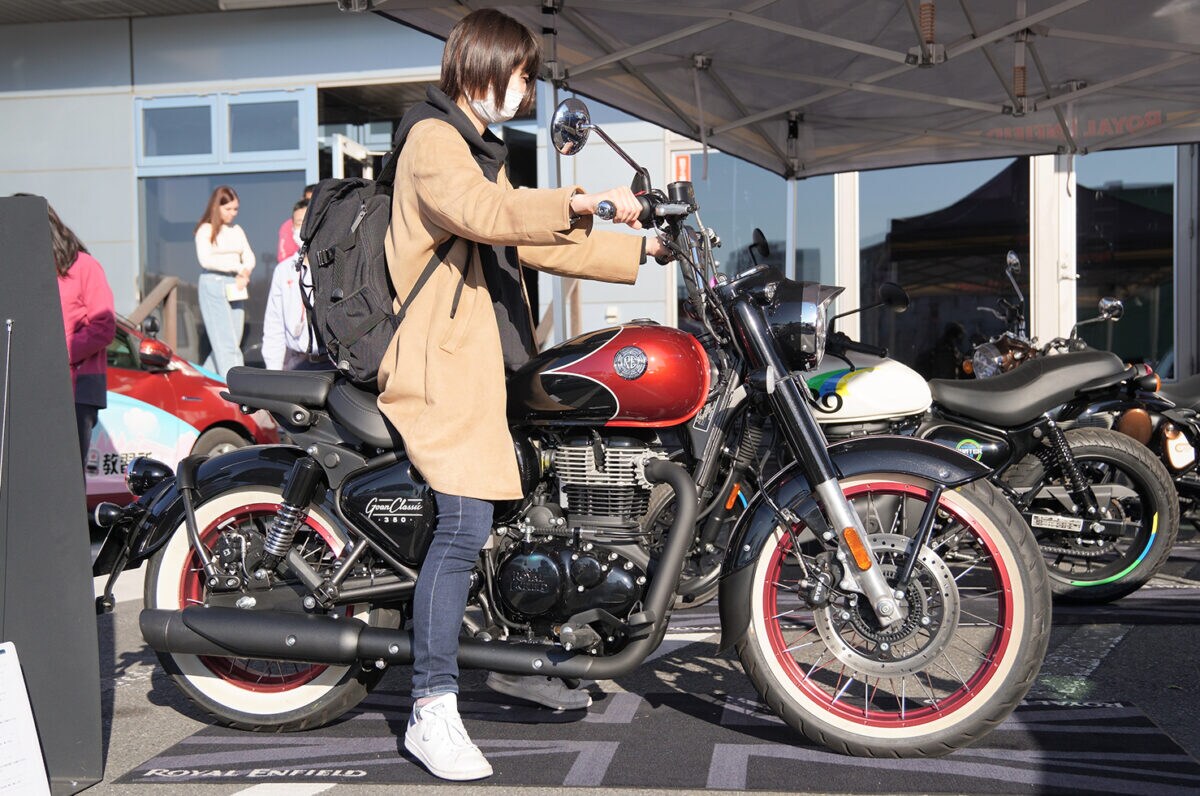 「大きく見えるけど両足のつま先が着くし、バイクも安心して支えられる。ポジションもちょうどよくて楽!」「展示の色がかわいかったけど、他の色もかっこよくて気になる」と、ロイヤルエンフィールドモデルのカラーバリエーションの多さにも驚いていた。