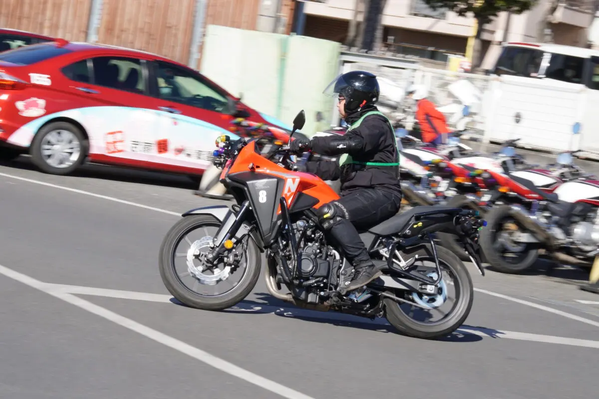 「足着きはいいしハンドル位置もちょうどよかった。最初の印象は”カッコいいけど、重そう”と思ったけど、少し重いと思うくらいだった」と伊蓮さん。跨ってバイクを足で支えるのに「不安は全然ないです」と、その安定感に驚いていた。