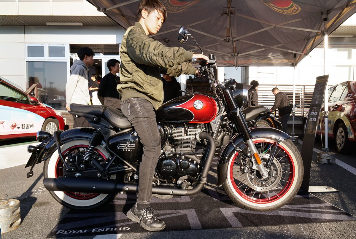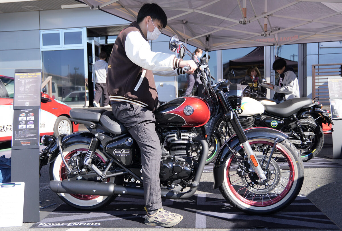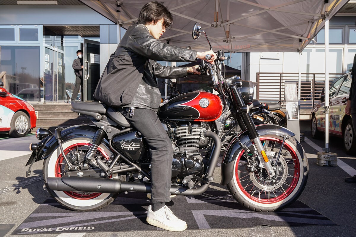 イベントブースに熱い視線を送っていたコジローさんは、近所のロイヤルエンフィールドディーラー入口に展示中の「GOAN CLASSIC 350(ゴアン・クラシック350)に一目惚れ」し、そのまま自動二輪免許を取りにきたという未来のオーナーだった。