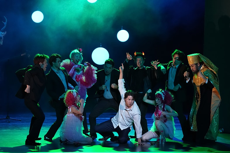 被害者がポルノ映画に出演していた女性であることが判明し、捜査を開始するイグネイシアス・ストーン巡査部長(伊礼彼方)とチャーリー・リー警部(浅野雅博)の二人は、第1幕では刑事ドラマのバディ同士としてジョークもまじえつつ軽快に振る舞っていたが、だんだんとその軽快さが影をひそめ、ノワールな霧に包まれる。捜査劇のあいまに、音月桂のデカダンな歌曲ショーがインサートされて、デイヴィッド・リンチ的な夢魔へと誘い込む。