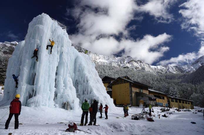 冬場の赤岳鉱泉は、アイスクライミング体験ができる”アイスキャンディー”が設置されています。通年営業の赤岳鉱泉は、夏は登山、冬は、登山をはじめ、アイスクライミング、冬期登攀の拠点ともなる山小屋で、一年を通して登山者に多く利用されています。