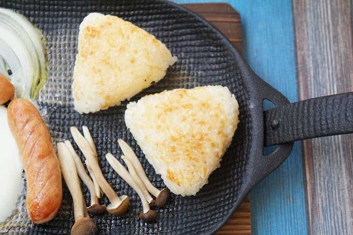 表面はエンボス加工が施されていて食材がこびりつきにくく、焼きおにぎりもご覧の通りいい具合に。鍋敷きとハンドルも一緒に付いてきます。