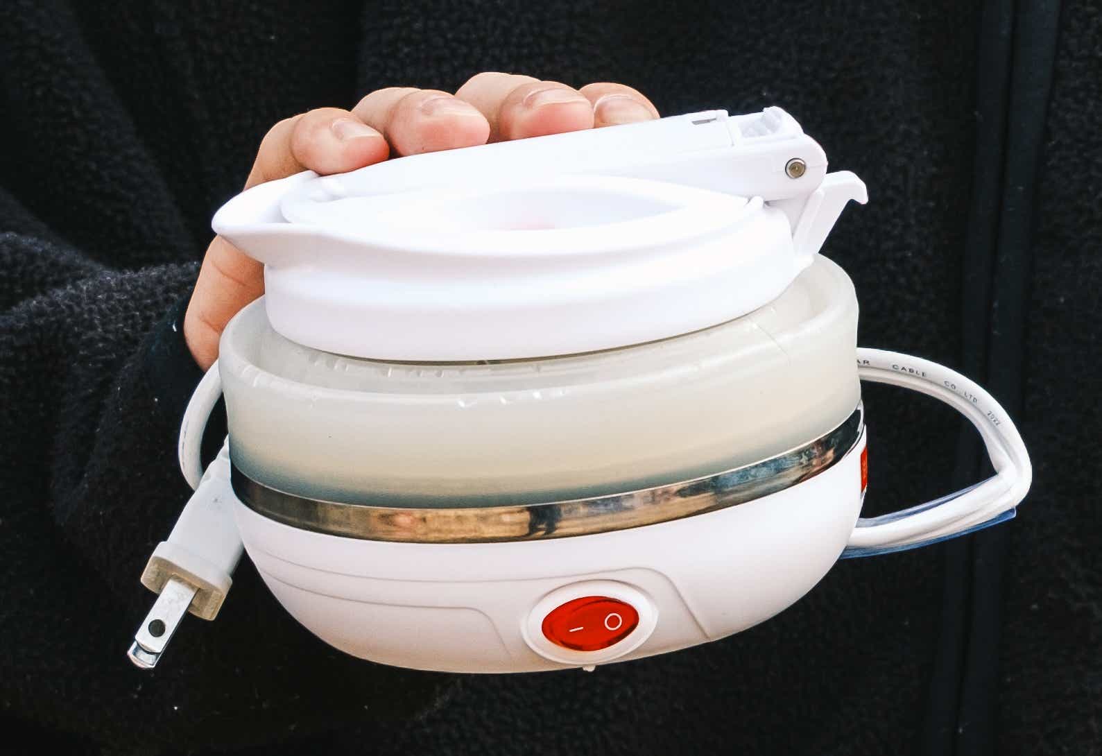 車内での火気使用は非常に危険ですが、湯沸かしくらい簡単にできたら便利だなぁ~と思い見つけたのが、この折りたためる電気ケトルです。