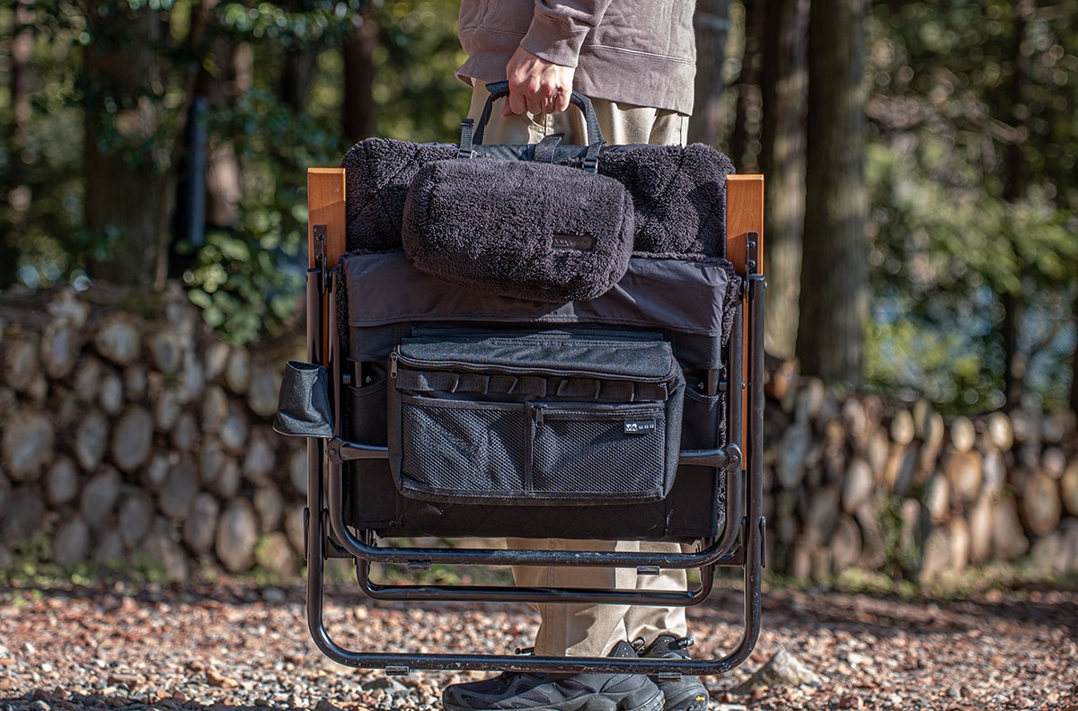 このヒートカバー、重量はわずか約520g(ヘッドレスト含む)。収納時はコンパクトにまとまり、付属の収納袋に収まります。チェアに装着したまま折りたたみもできるため、撤収時の手間が少ないのもうれしいポイントです。