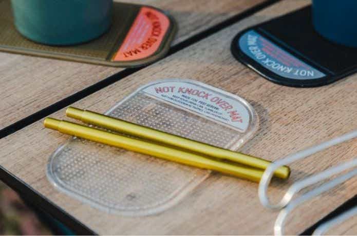 工夫次第でさまざまな用途に使えるポストジェネラル「ノットノックオーバーマット」。PUゲル素材の小さなマットで、箸が転がるのを防いだり、ビールを倒してしまうのを防いだりできます。