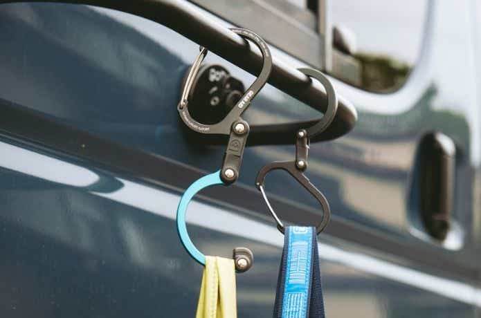 ギアエイド「ヒーロークリップ スモール」は、回転式フックとカラビナを組み合わせた多機能クリップ。360度回転するフックにより、バッグやランタン、タオルなど多様なアイテムをテントのポール、テーブル脚、木の枝などにかけられる点が画期的です。