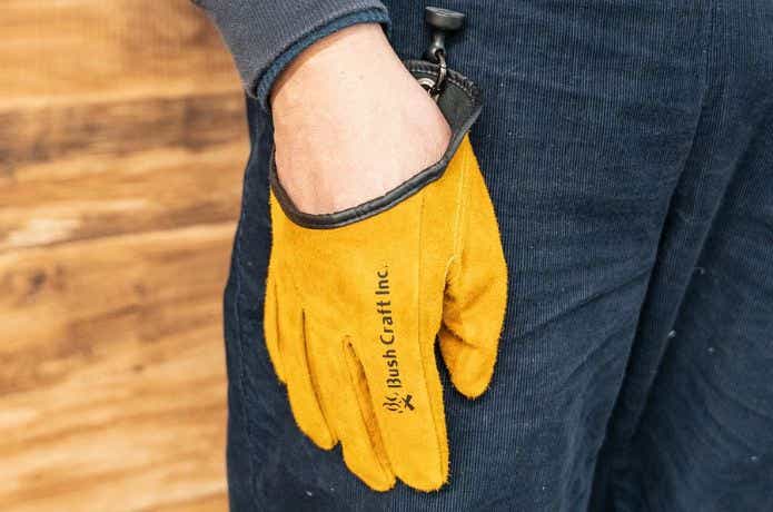 ブッシュクラフト「クイック焚き火グローブ」は、耐熱性に優れたやわらかい革製のグローブ。マグネット式のカラビナが付属しており、ベルトループにかけておけば使いたいときにすぐに取り出せる点が便利です。手を入れやすい浅型設計になっていて、着脱しやすい点も魅力ですね。