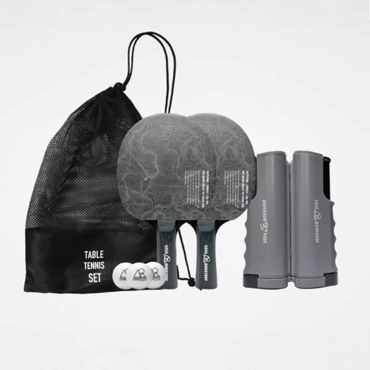 5050 WORKSHOP「TABLE TENNIS SET」は、どこでも卓球が楽しめる携帯セット。専用ネット、木製ラケット2本、ボール3個がコンパクトな収納袋に収まっており、キャンプテーブルやダイニングテーブルを即席卓球台に変身させることができます。