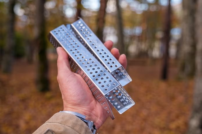 四角い筒状のステンレスにボコボコと穴のあいたユニフレーム「メタル薪」。一見何に使うかわかりませんが、焚き火にくべることで空気の通り道を確保し、燃焼効率が上がります。テントや焚火台のような必須アイテムではなく、ニッチなアイテムなので、キャンプ好きでも持っていない人が多いのではないでしょうか?