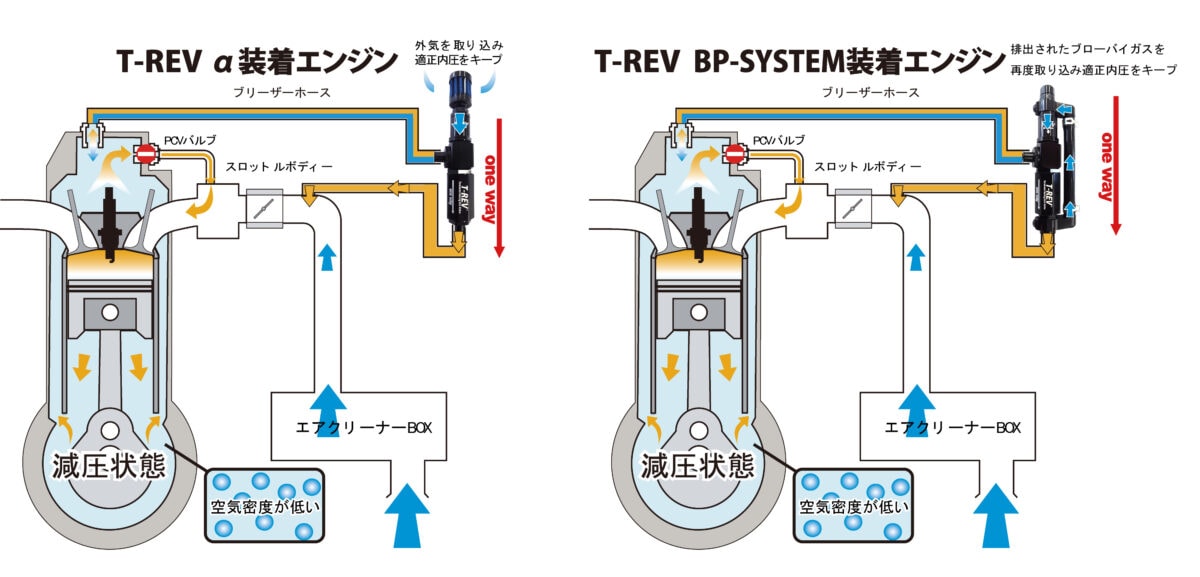 これにより、抜いて内圧が下りすぎたら外気を取り入れる=内圧が上下して安定しきらなかった「T-REV α」と比べ、「T-REV BP」は状況に応じて循環させることで内圧を適正値に整え、エンジン内圧の安定化につながる=減圧の効果が低回転から高回転まで安定した。