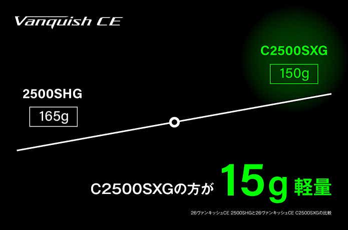 C2500SXGと2500SHGはほぼ同じラインキャパシティや最大巻上長を持ちながら、C2500SXGの方が15g軽い設計。