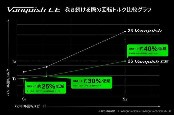 デッドスローのS1(3秒で1回転)ではCEのハンドル回転トルクが約25%、ルアー回収時などの高速域S2では約40%も減少。