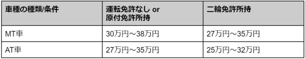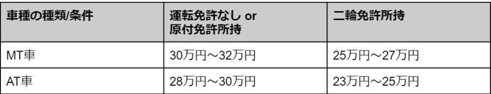 まったくの未経験者であれば、AT車で28万円から30万円、MT車では30万円から32万円程度が相場となるでしょう。