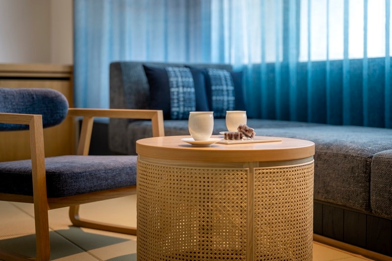 ソファのクッションには、広島県福山市を中心とする備後(びんご)地域の特産「福山デニム」を使用。伝統工芸「備後絣(びんごかすり)」の技術をルーツに持つ、深みのある藍色が空間を引き締めます。