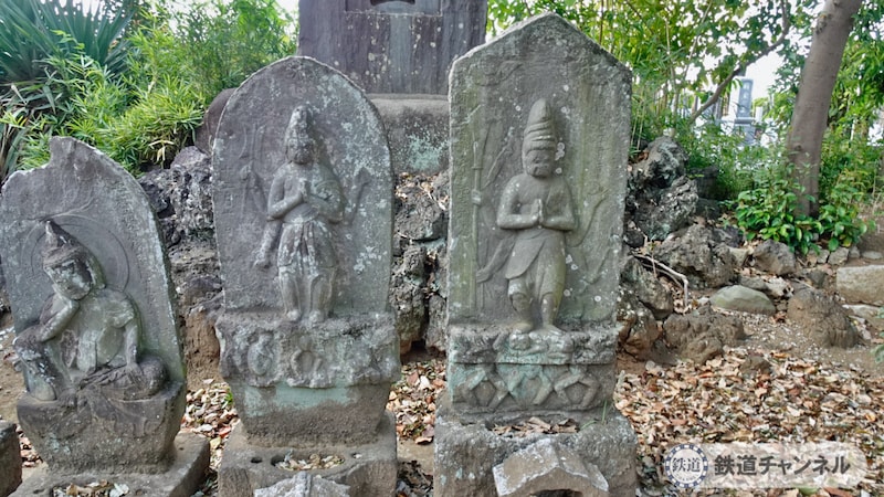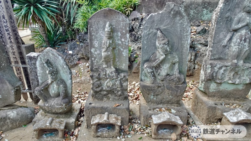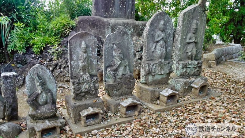 かつて本堂の屋根にのっていたのでしょうか。左奥に庚申塔が列んでいます。