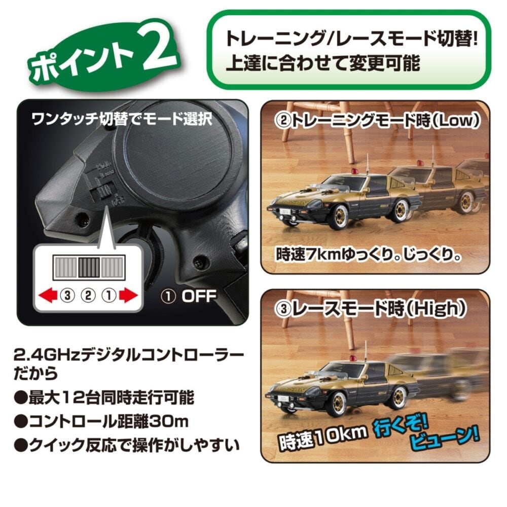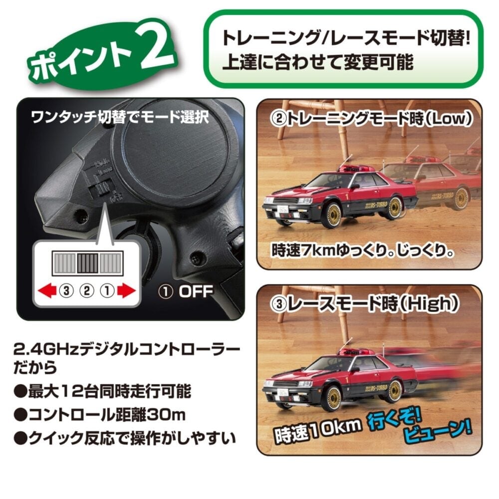 時速7kmのトレーニングモード(Low)と時速10kmのレースモード(High)が、コントローラーのスイッチでワンタッチ切り替え可能。ゆっくり、じっくり走らせたい時や操縦に慣れるための練習時はトレーニングモードがオススメ。トレーニングモードでの操縦に慣れてきたらレーシングモードに切り替えて、ハイスピード走行を楽しもう。