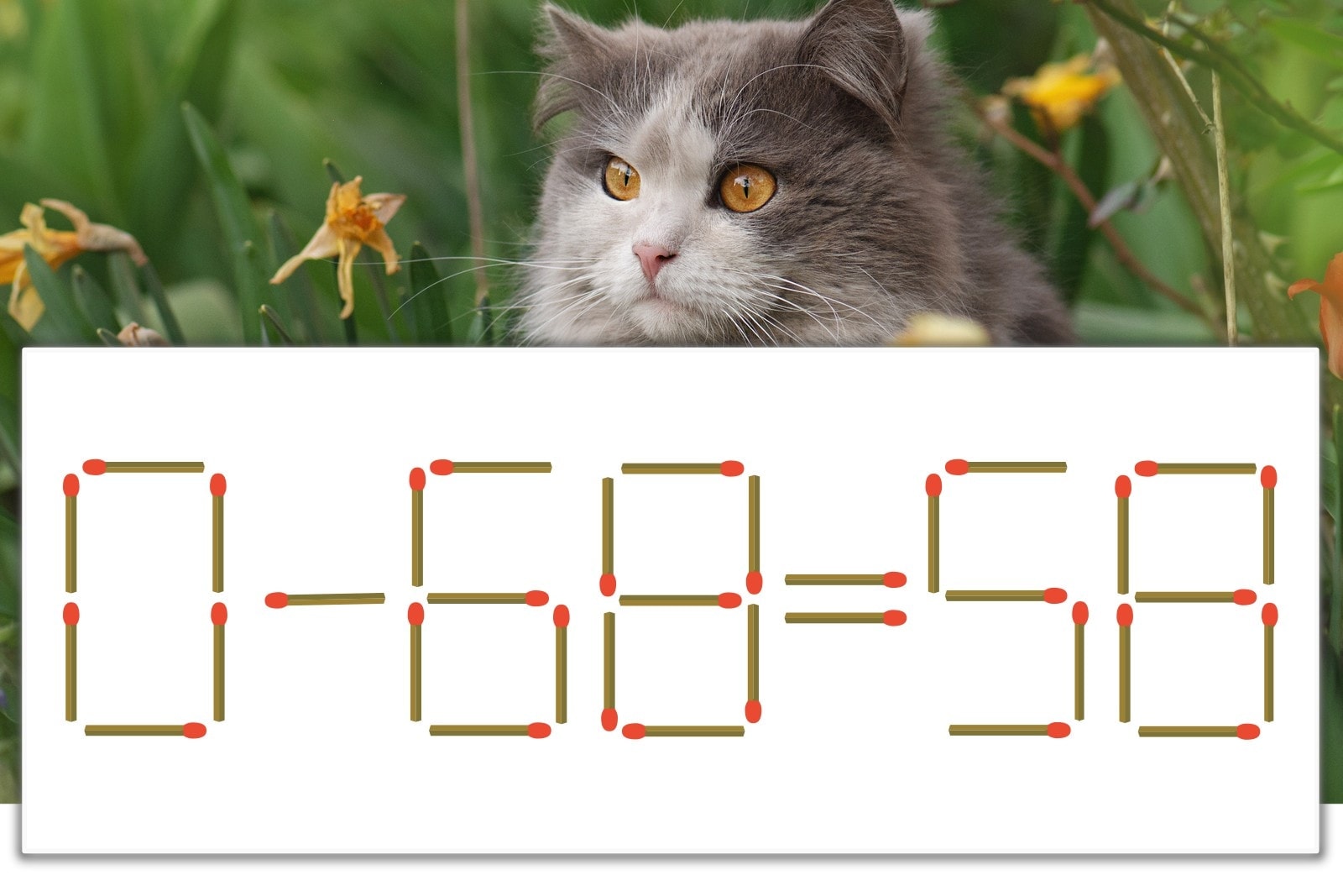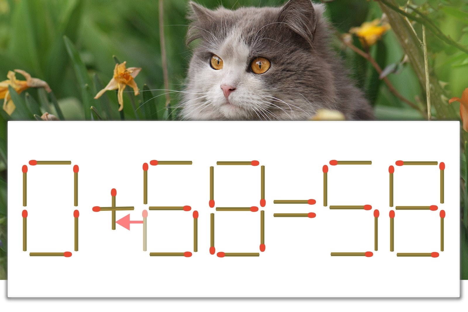 「6」を別の数字に変化させると答えが導き出せます。「6」のマッチ棒を1本移動して、「-」を「+」にしてみましょう。すると、「0+58=58」が成立します。